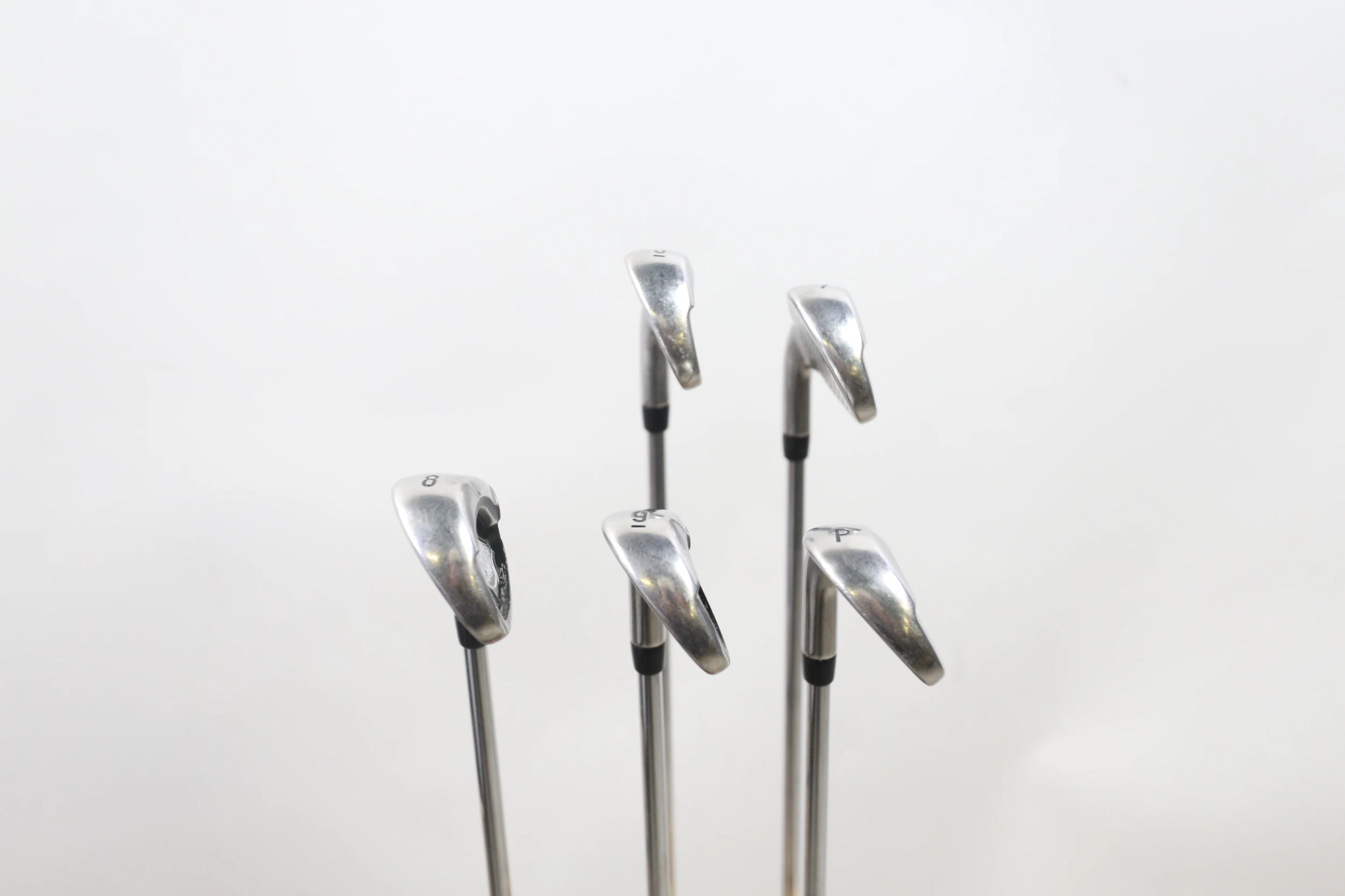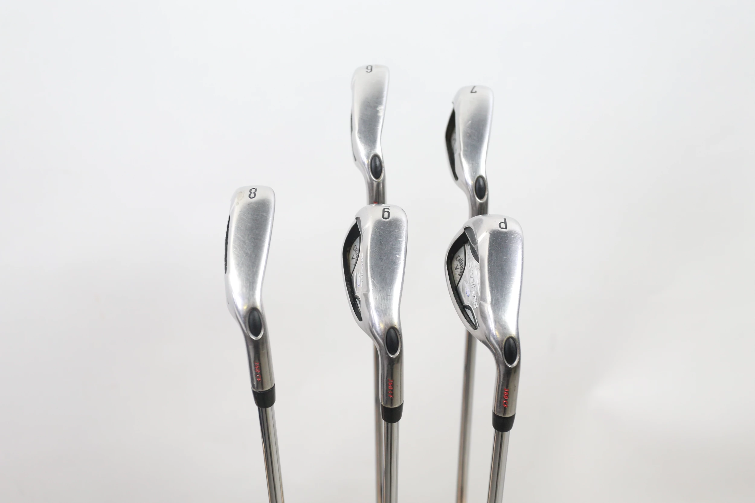 This Iron Set is in good condition. There is wear around the heads and on the faces of the clubs from use and play. There are also very small markings and scratches along the shafts from normal use and storage. The grips are in good condition with average wear from handling and storage. The shaft flex was loosely determined using a deflection board. Please see pictures provided for more details.